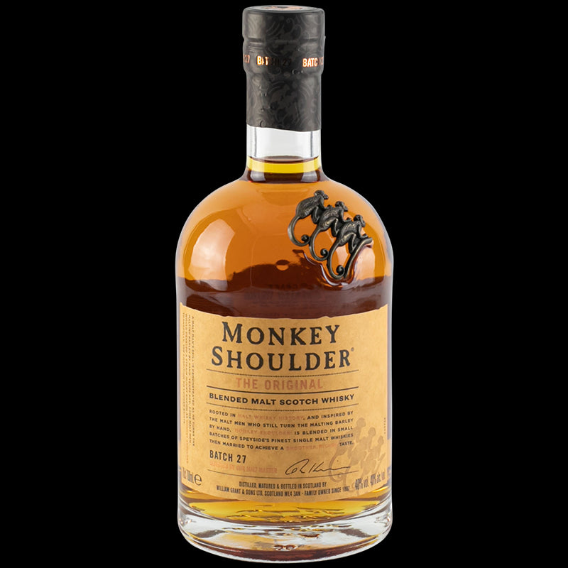 Les “maltmen”, qui autrefois remuaient l’orge à l’aide d’une pelle, étaient constamment exposés aux courants d’airs qui leur occasionnaient de sérieux rhumatismes. Cette maladie du maltage était connue sous le nom de « monkey shoulder », l’épaule du singe. C’est en hommage à ces maltmen que la famille Grant’s propriétaire de la distillerie emblématique Glenfiddich, a créé ce « triple malt » élaboré à partir de l’assemblage de trois single malts (Glenfiddich, Balvenie et Kininvie) aux arômes de miel, de cannelle et de vanille.